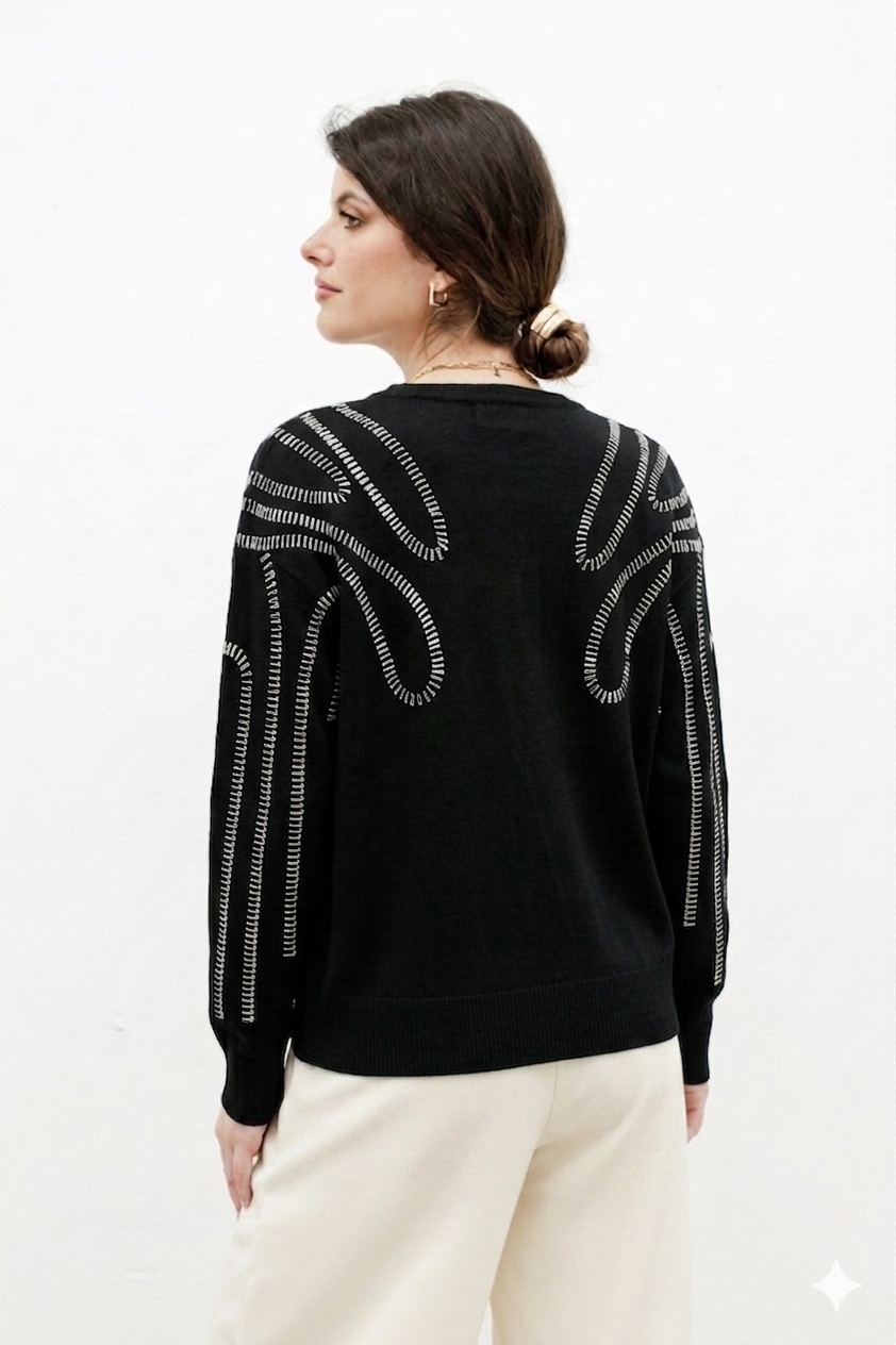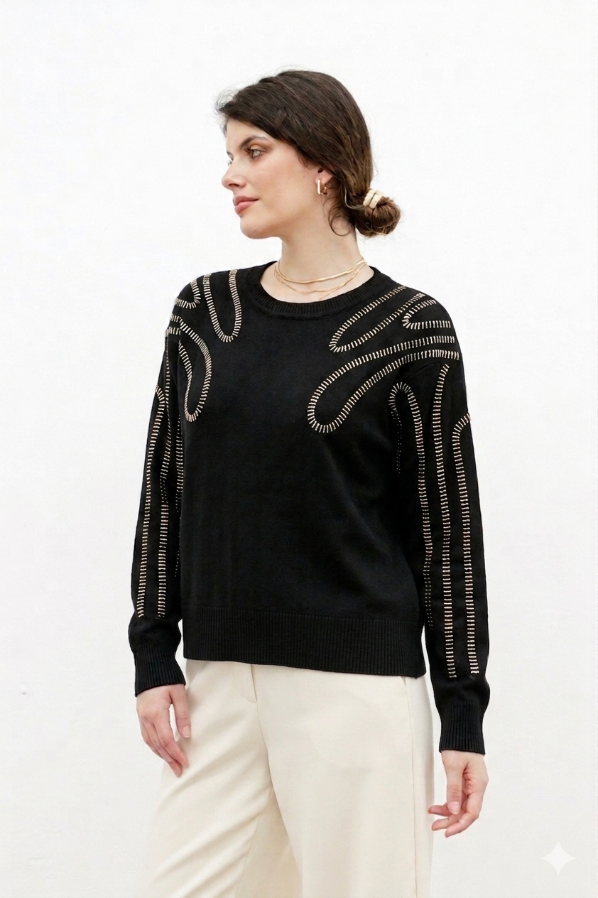 Sweater tejido de bremer doble cabo con diseño de tachas rectaculares.