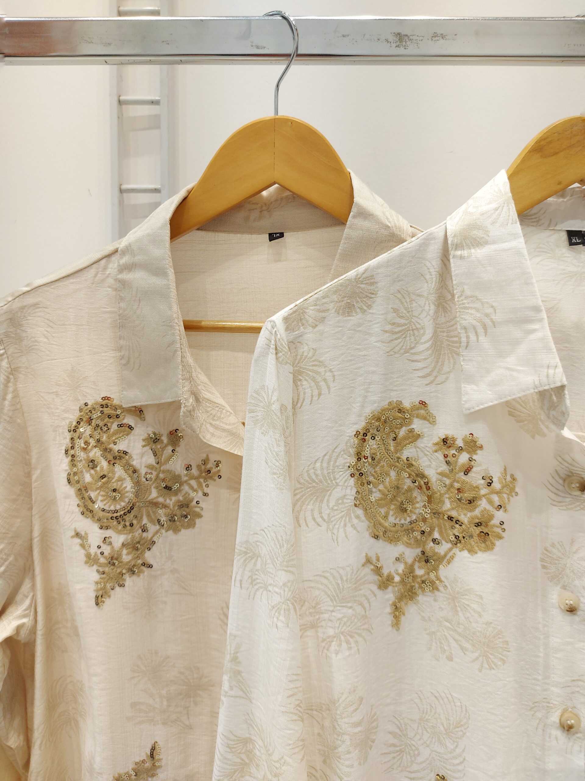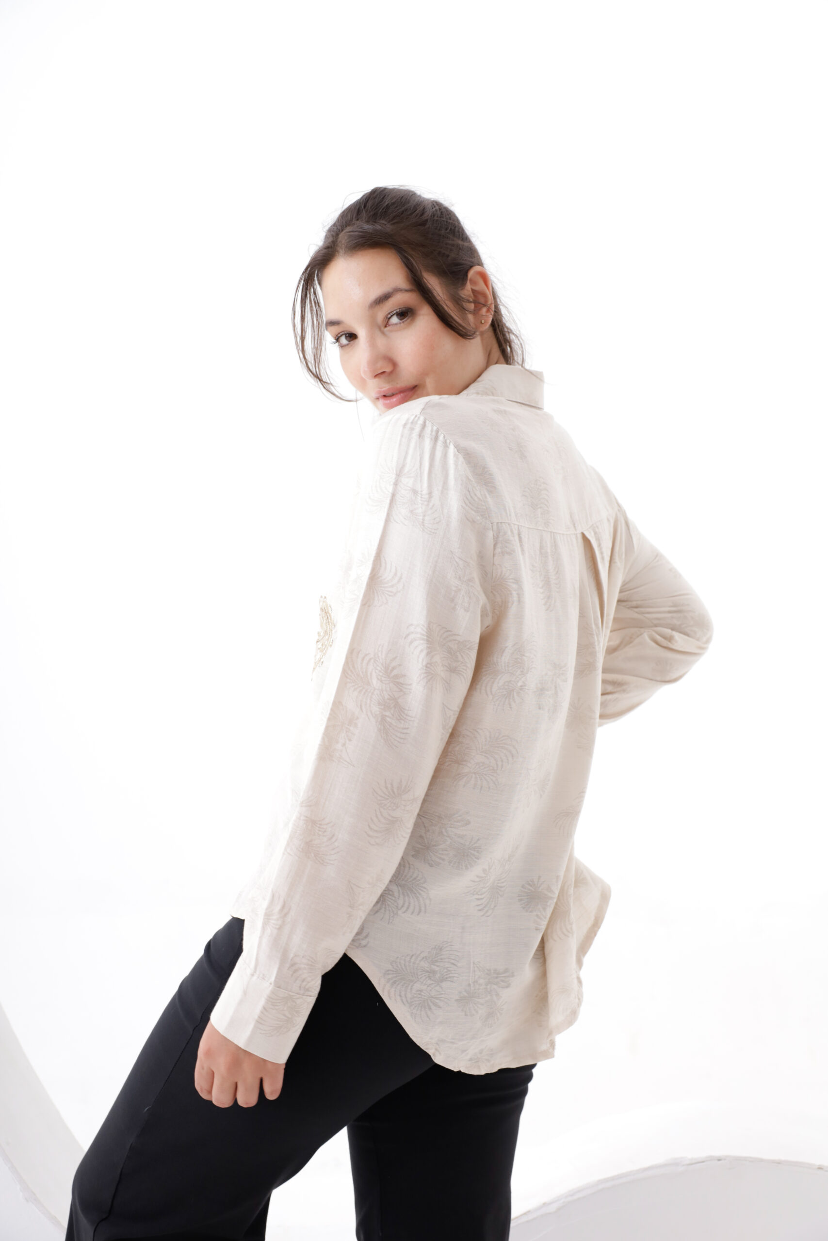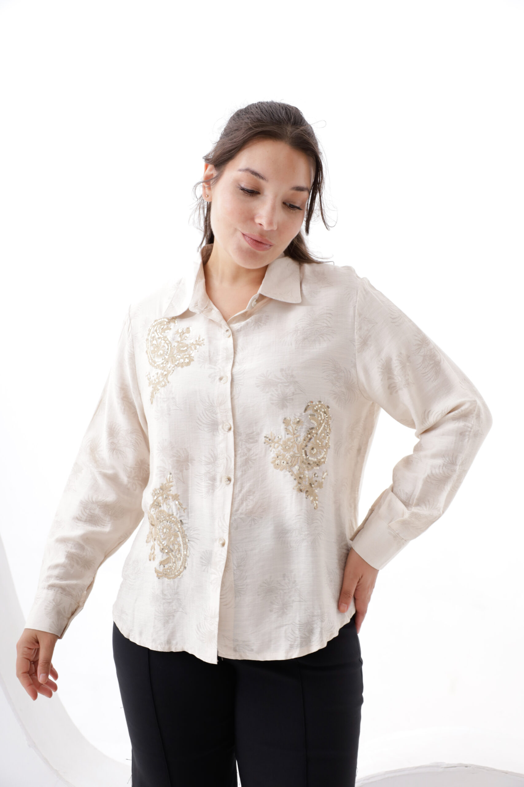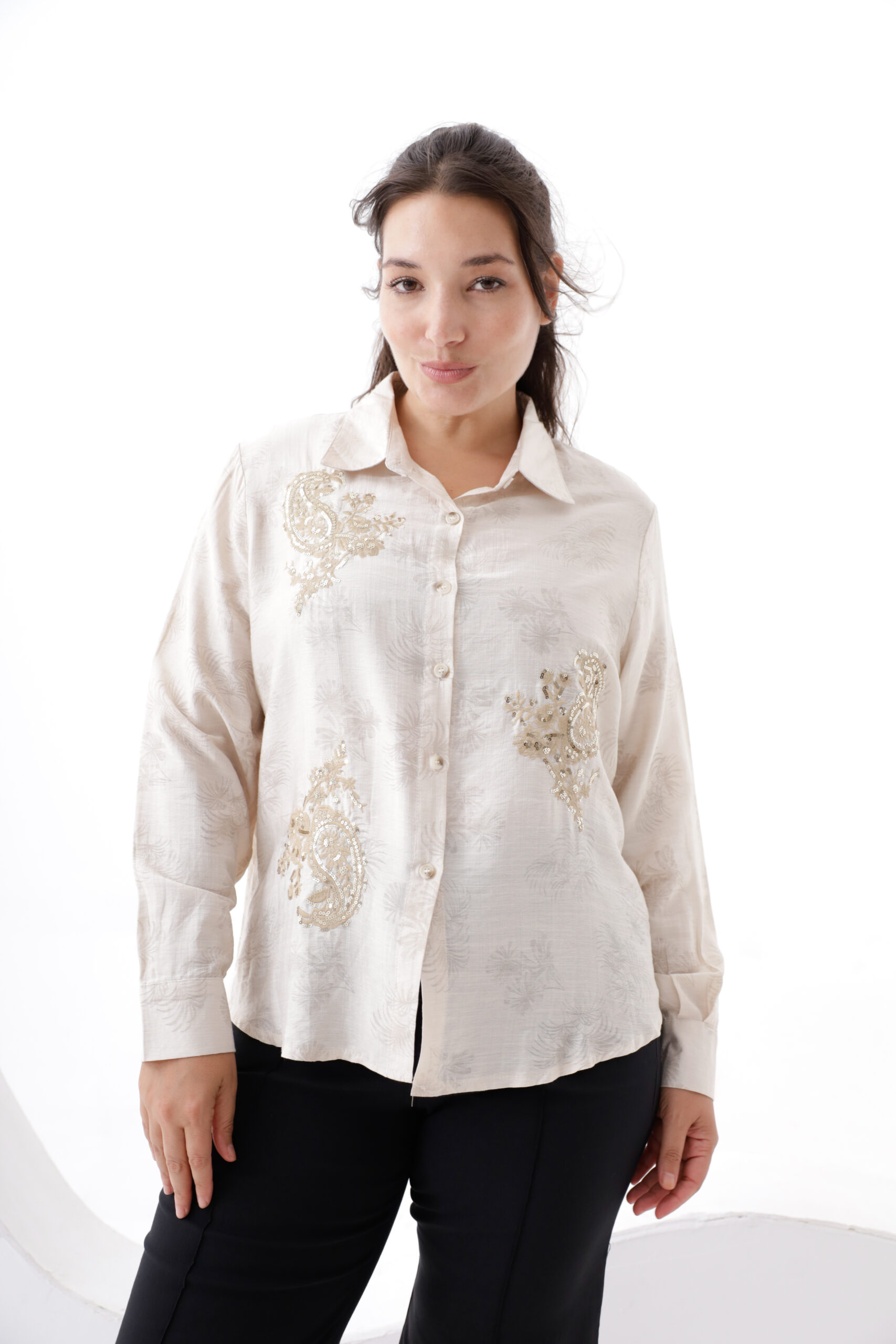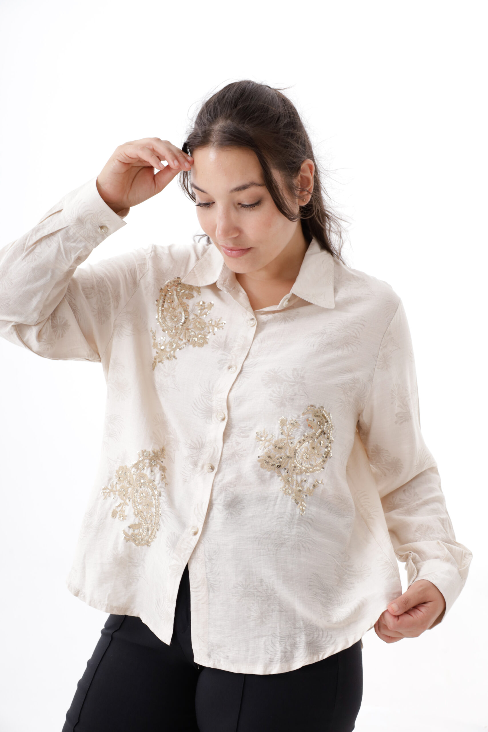 Camisa de tela estampda con borado de lurex y lentejuelas.