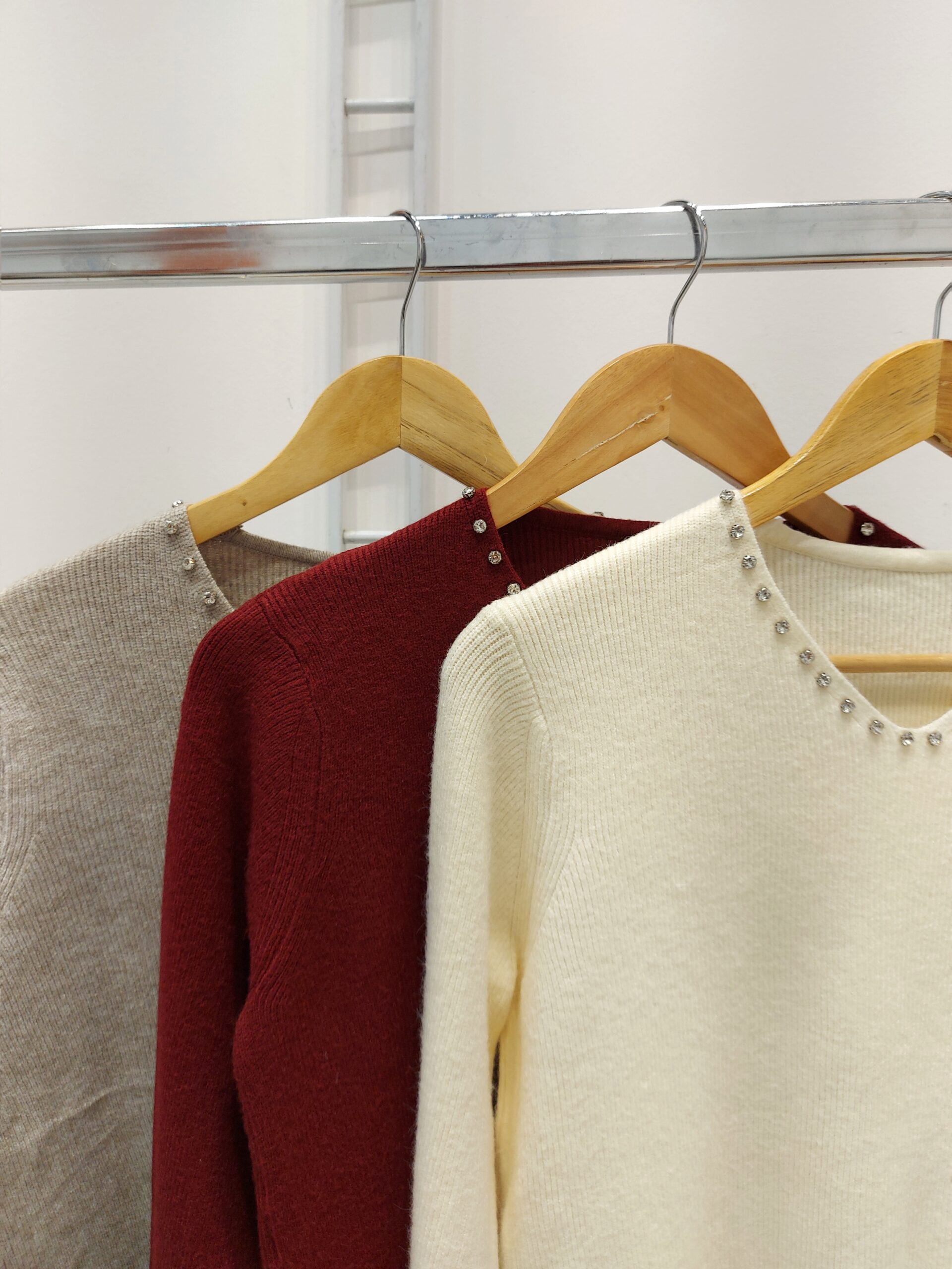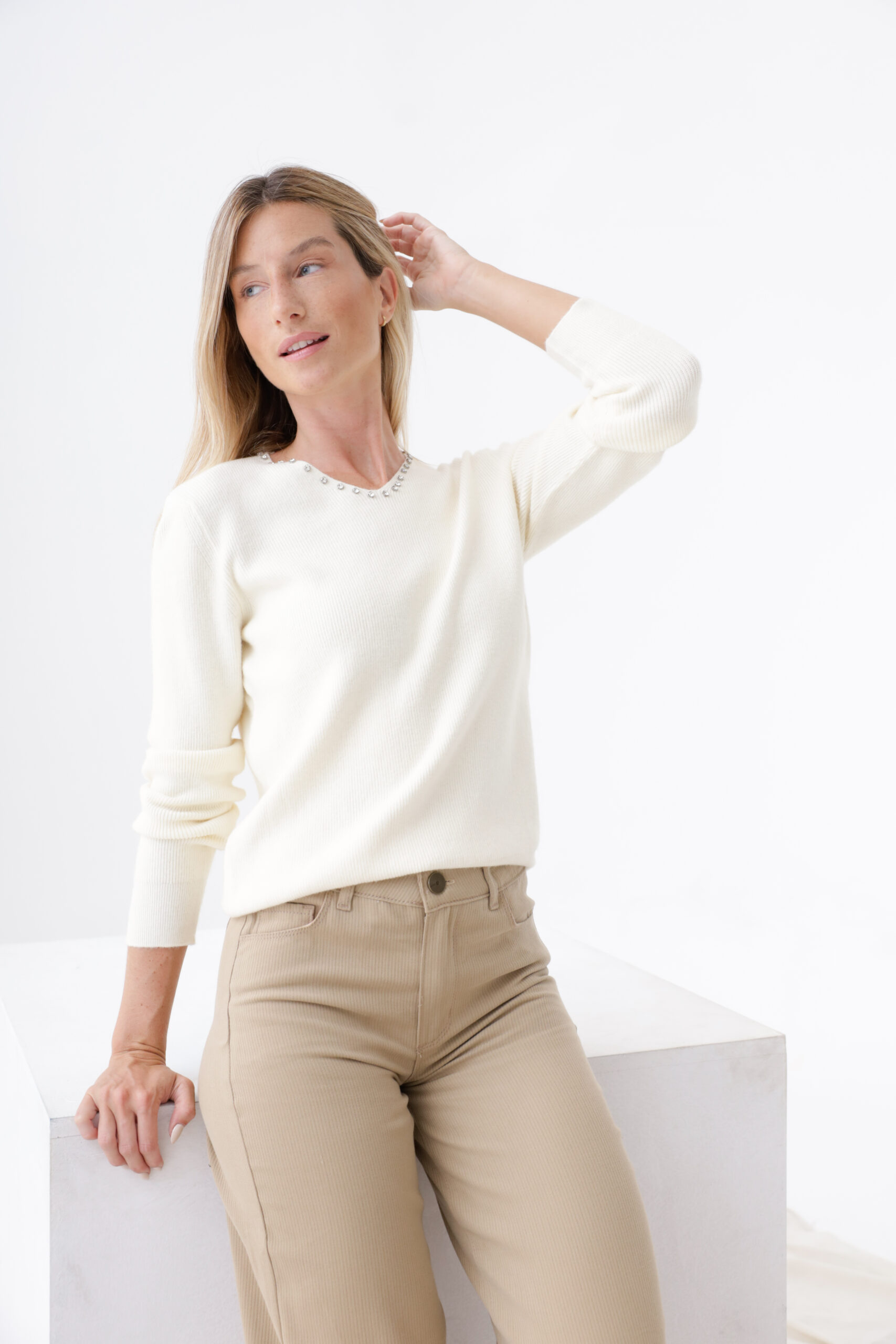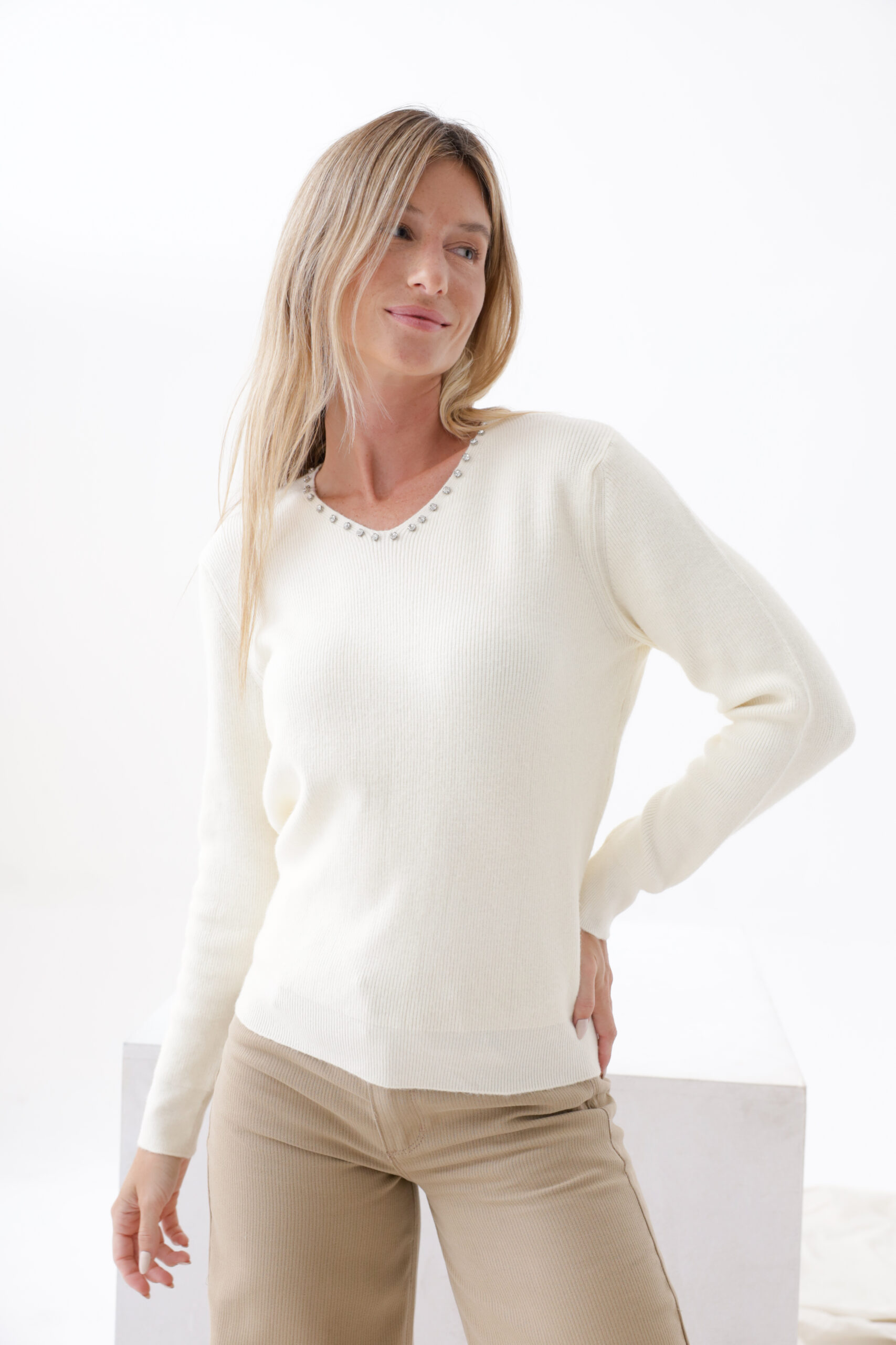 Sweater tejido doble cabo en escote V con piedras en el escote